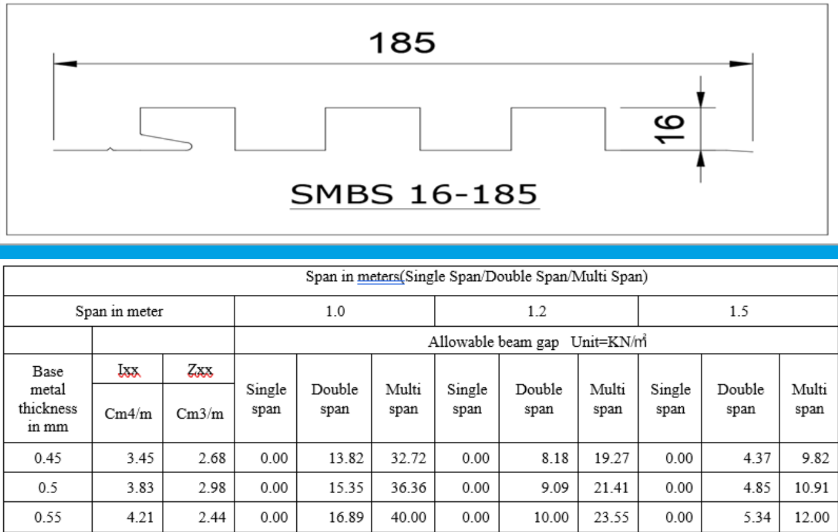SMBS 16-185 Multi Rib Sheet of 16mm Depth,185mm width Sheets are used below the Flashings, at Upper Coat Location, Walk Way etc. These Panels are used at Ridge, Gable, LFlashings applicable on Roofs.