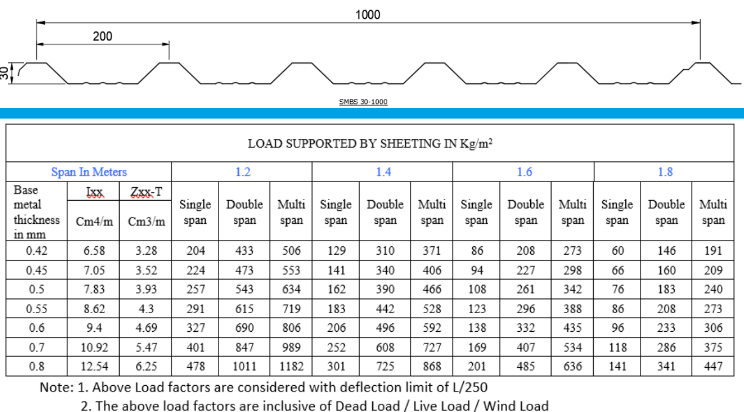 SMBS 30-1000 trapezoidal Roof and Cladding Sheets of 30mm Depth,200mm Pitch and 1000mm cover width. The Profile as a Wide pans with Anticapillary Water return with male and Female ends.